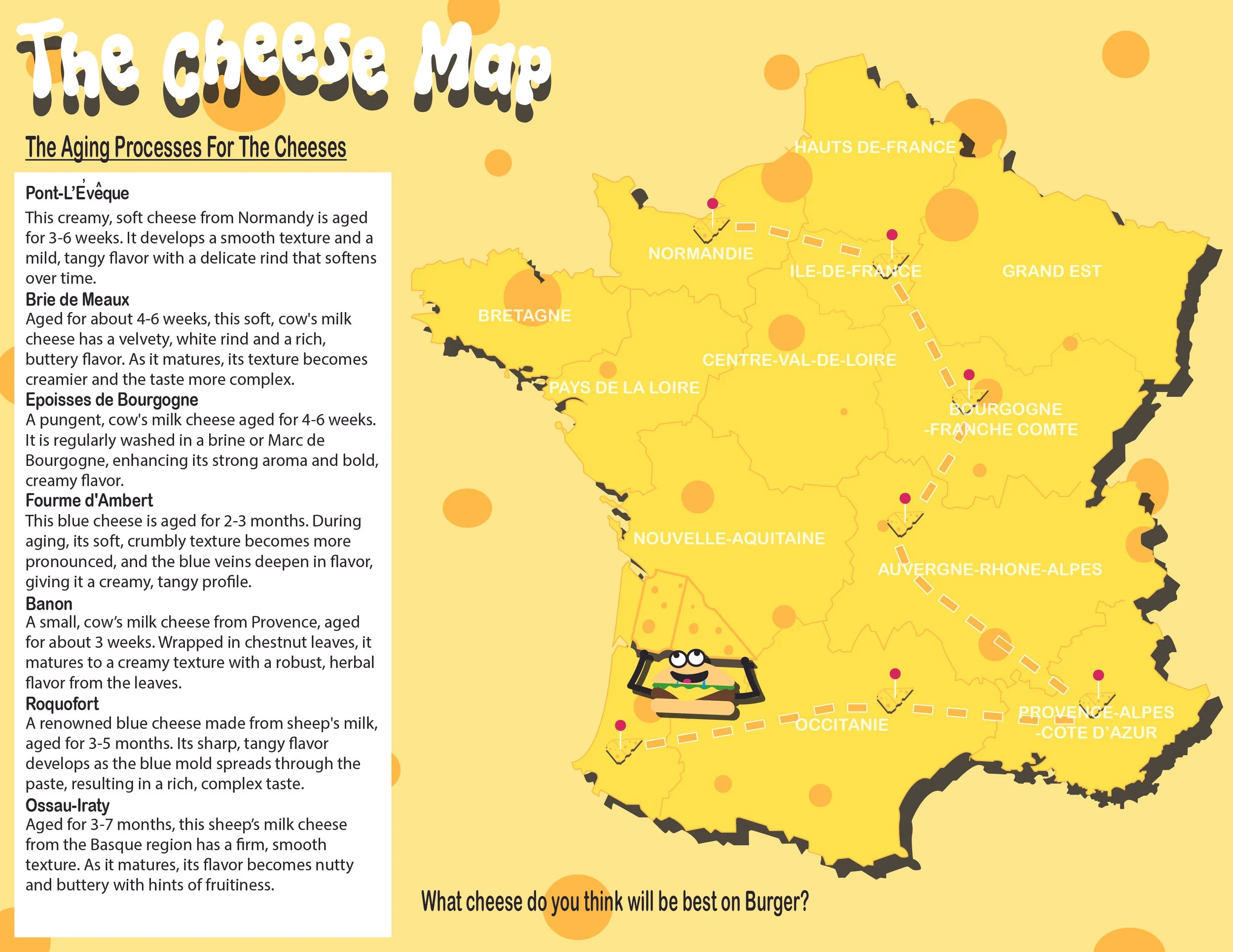 This trifold brochure was designed to present the history and cultural significance of French cheeses in a clear and engaging format. The layout uses structured typography, illustrated icons, and a stylized map of France to organize information about cheese varieties, aging processes, and regional production. A warm, cheese-inspired color palette helps visually connect the design to the subject matter while maintaining readability and visual balance. The project emphasizes strong information hierarchy and thoughtful visual storytelling to create an informative and cohesive print design.